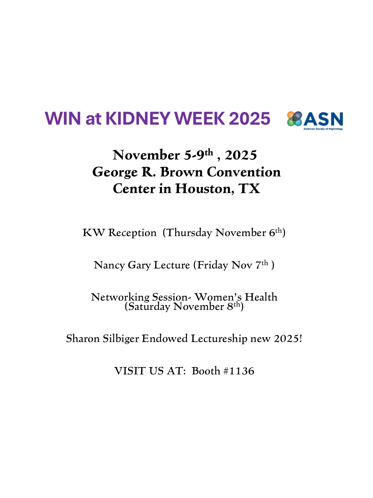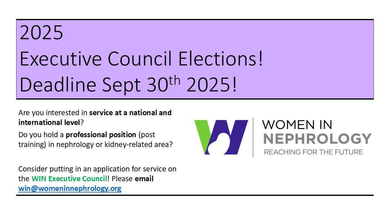 Elections Nominations are open. Deadline: September 30th, 2025 Open for the following positions: 5 Council Members, Secretary, President Elect If interested, please email: win@womeninnephrology.org