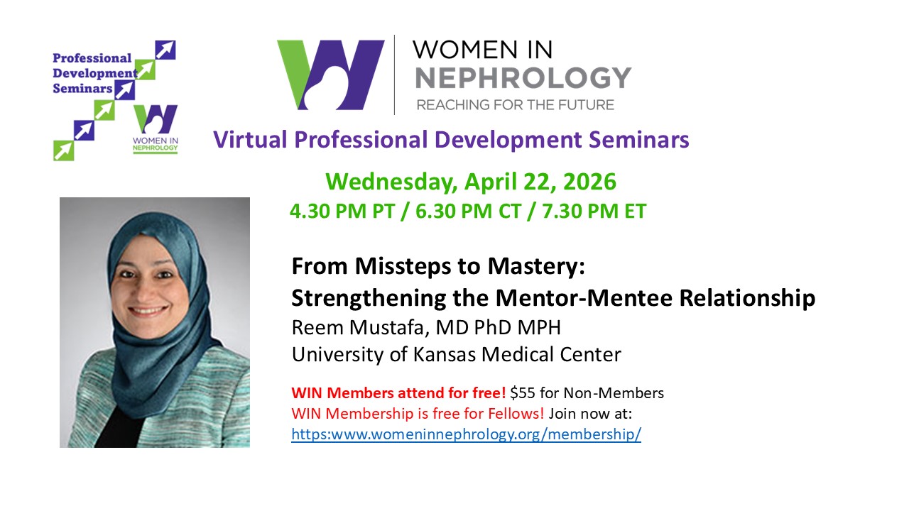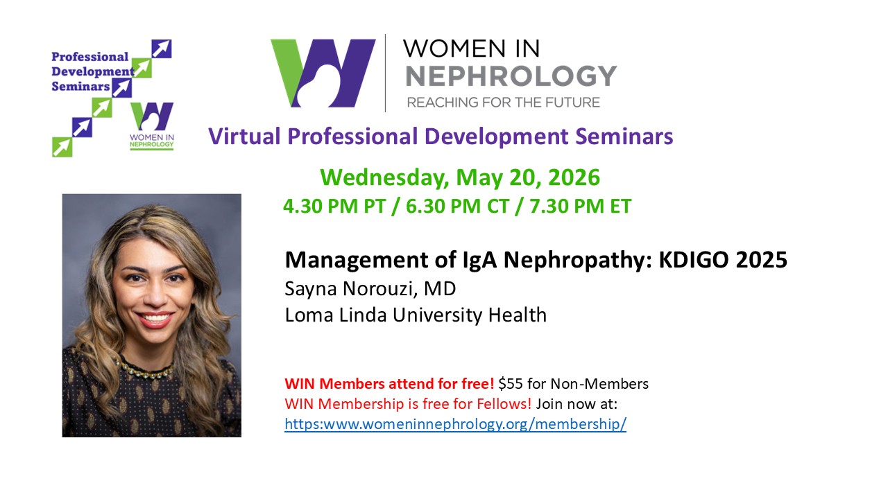 Virtual seminars designed to support career advancement, leadership development, and professional growth in nephrology.