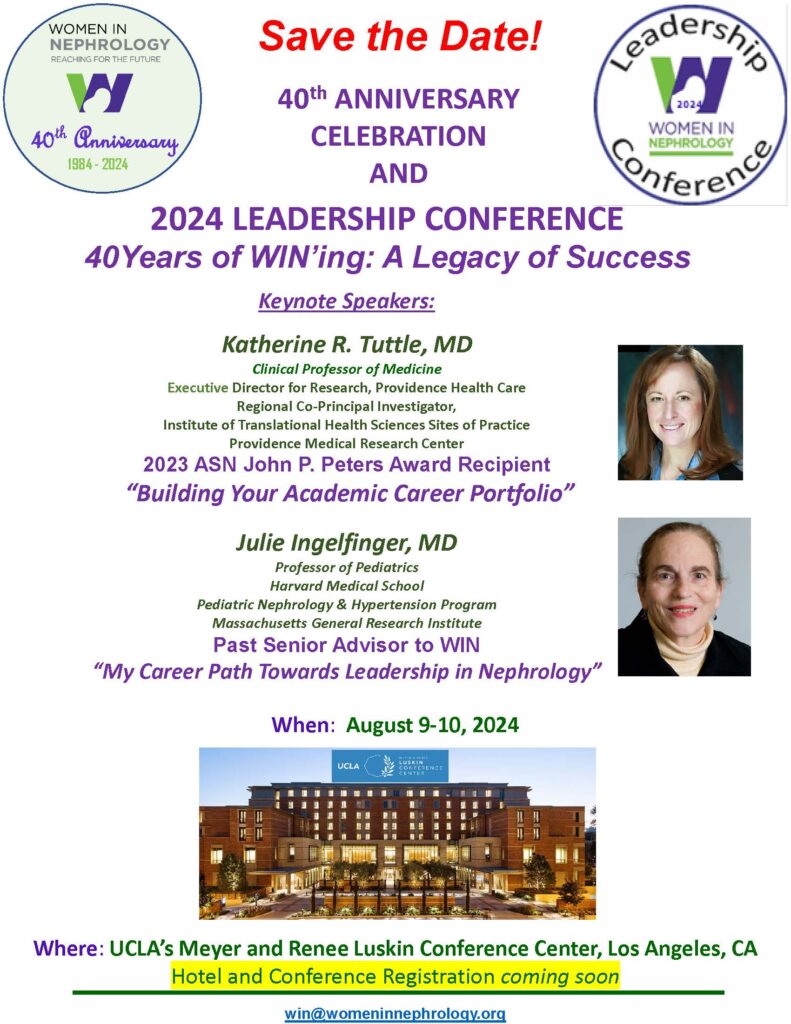 Celebtrate 40 Years of WIN’ing: A Legacy of Success. Keynote speakers include Katherine R. Tuttle, MD and Julie Ingelfinger, MD.